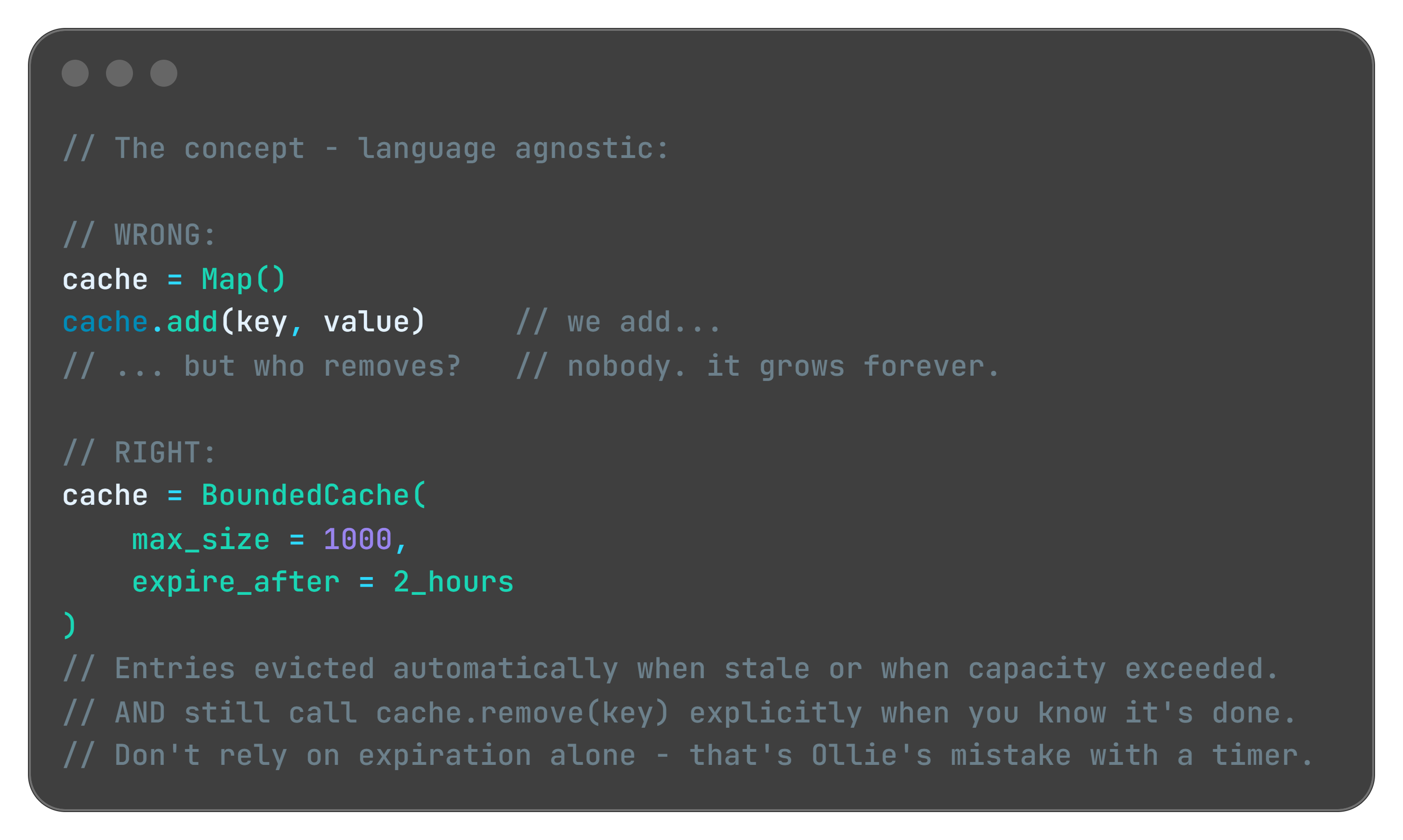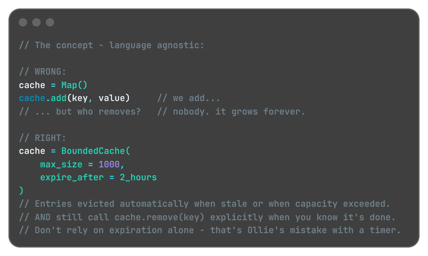 For collection-based leaks (the Ghost Tables scenario) the fix is using the right data structure. A plain map or list with no eviction policy is a ghost table factory. Use a bounded cache with explicit expiration instead:
