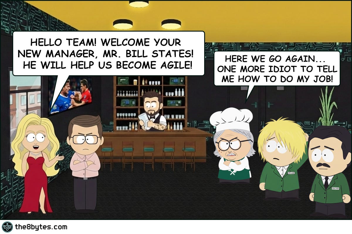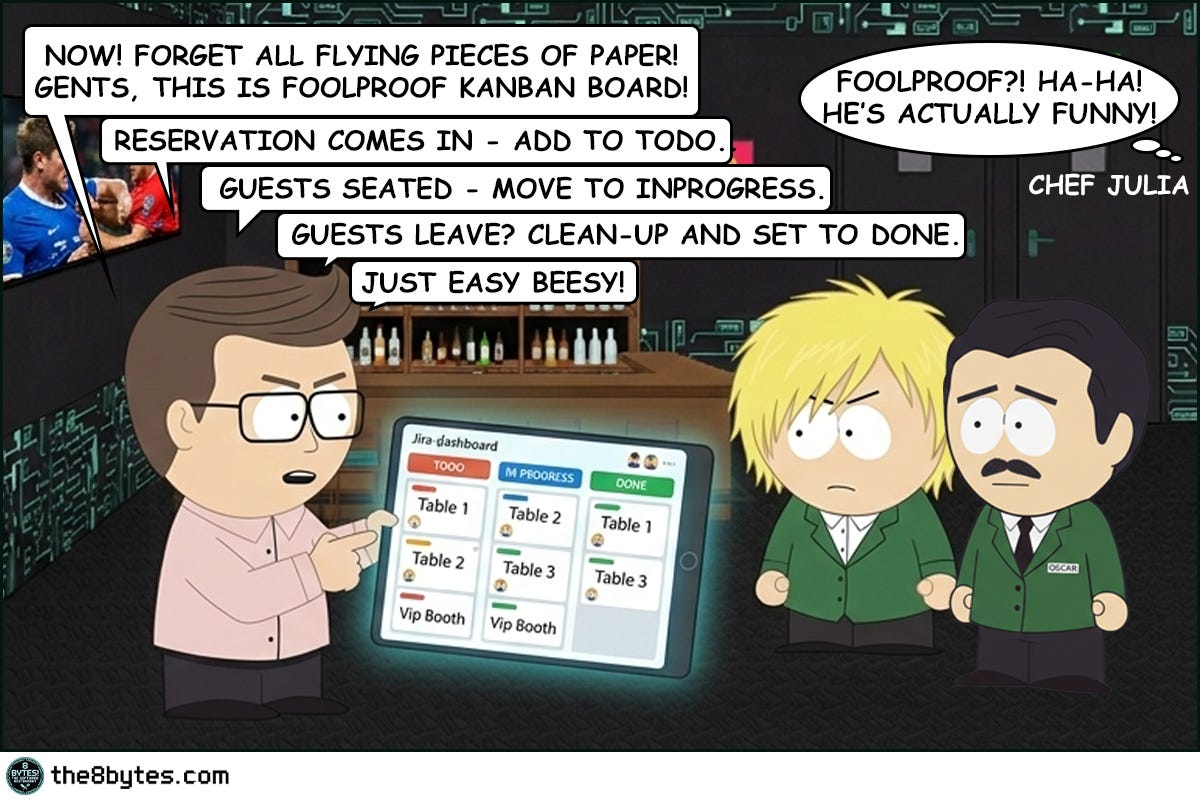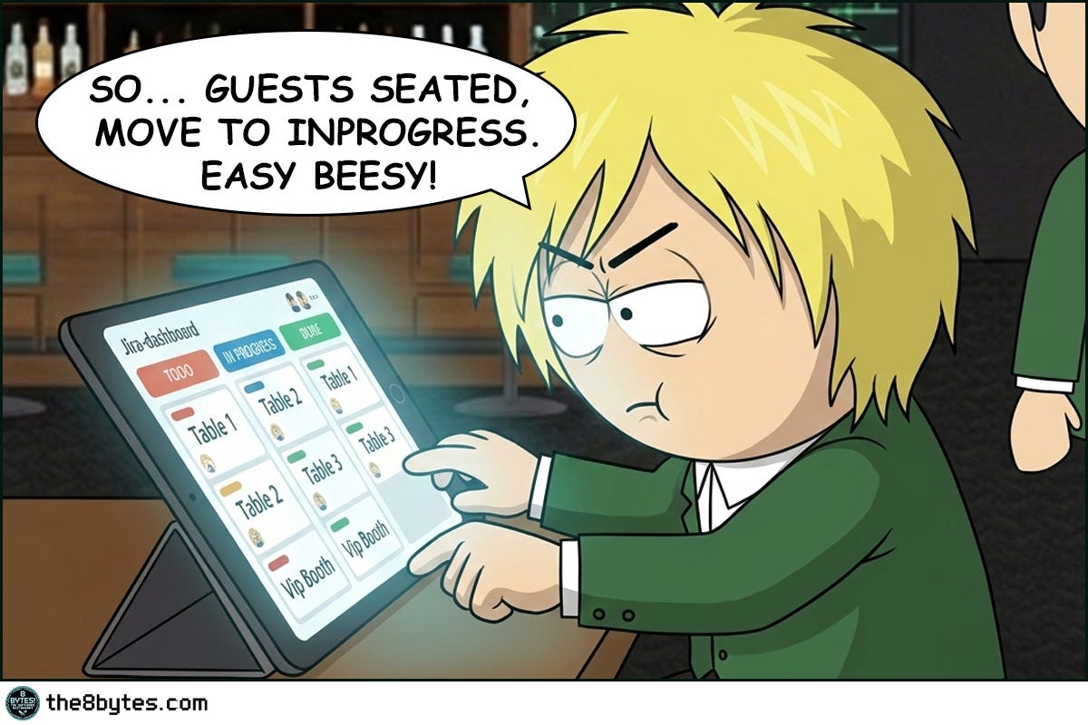 Cody, bartender at 8 bytes! The Software Restaurant: “Bill States, the new restaurant manager arrived with a tablet, a smile, and the unshakeable confidence of a man who had never witnessed what happens when humans meet systems at 11:30 PM after a double shift.