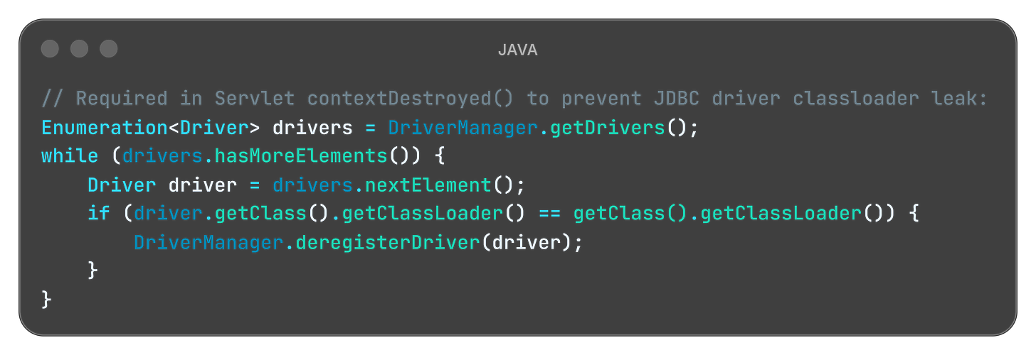 In Java EE and Spring applications, hot deployments can cause classloader leaks. When you redeploy, the old classloader should be garbage collected. But if any static field, thread local, or external library holds a reference to a class from the old classloader, the entire old classloader - and all the classes it loaded - stay in memory. Redeploy ten times and you’ve effectively loaded your application into memory ten times simultaneously.