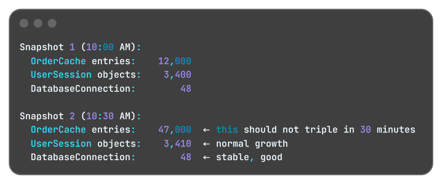 🔧 Production Pattern: Add heap trend metrics to your standard monitoring. Alert when the 24-hour slope of heap usage exceeds a threshold - not just when absolute usage spikes. A leak that takes 3 days to crash you won’t trigger a “heap at 90%” alert until it’s too late to investigate calmly.