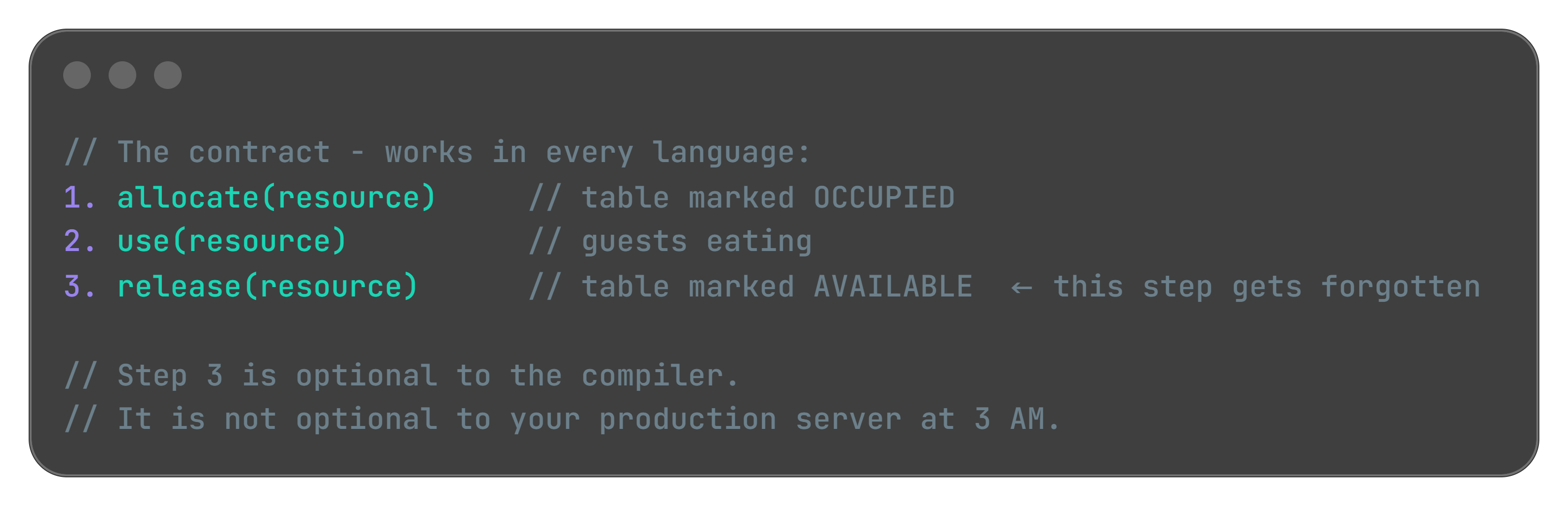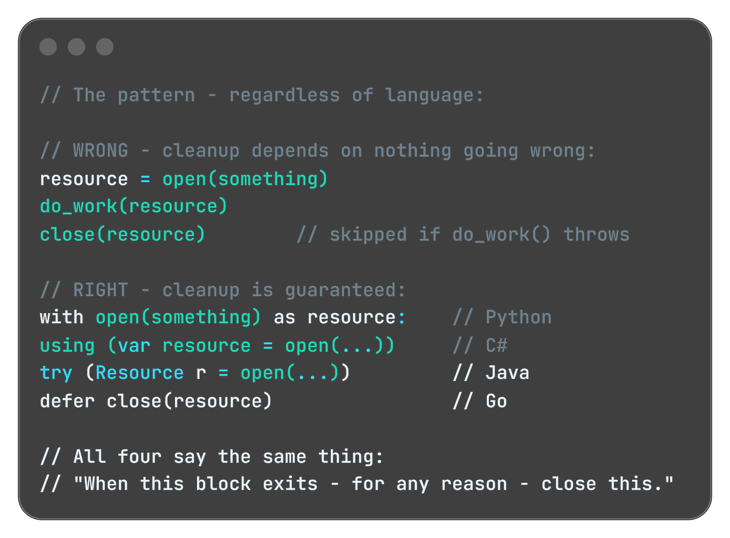 For Tech Leads: Ask in your next design review: “Who owns the cleanup of this resource? Is it explicit or assumed?” Assumed cleanup is a future incident.