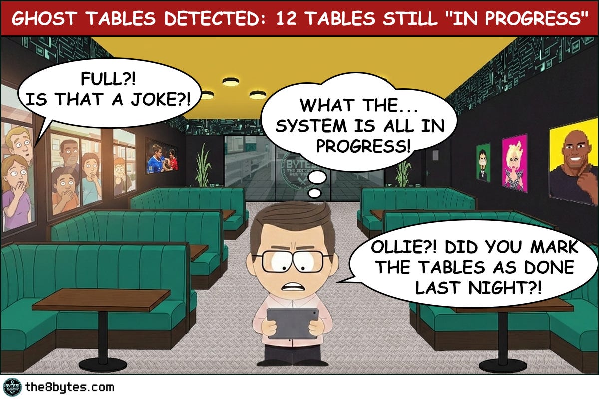 Unreleased tables become ghosts. Enough ghosts and the system thinks it’s full. In software, we call this a memory leak. In Bill’s restaurant, we call it a very bad morning.