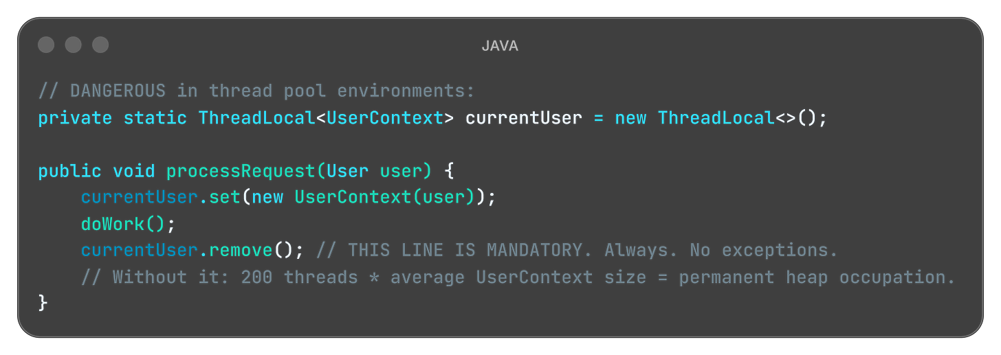 ThreadLocal stores data per-thread. In application servers, threads are pooled and reused across requests. If you store an object in ThreadLocal during a request and never remove it, every thread in the pool carries that object for the entire server lifetime.