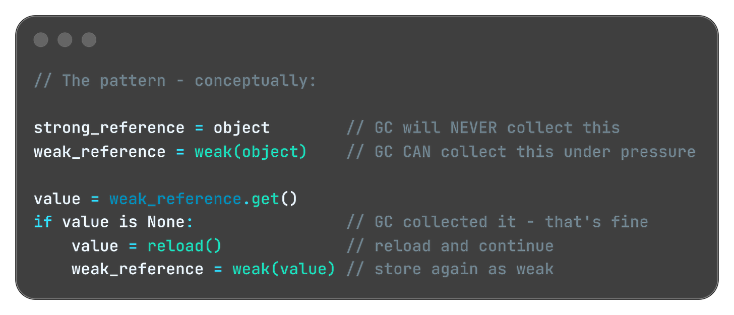 This is the right tool for image caches, computed results, and large objects that are expensive to create but not critical to keep. The cache helps performance when memory is available. It doesn't block the GC when memory is scarce.
